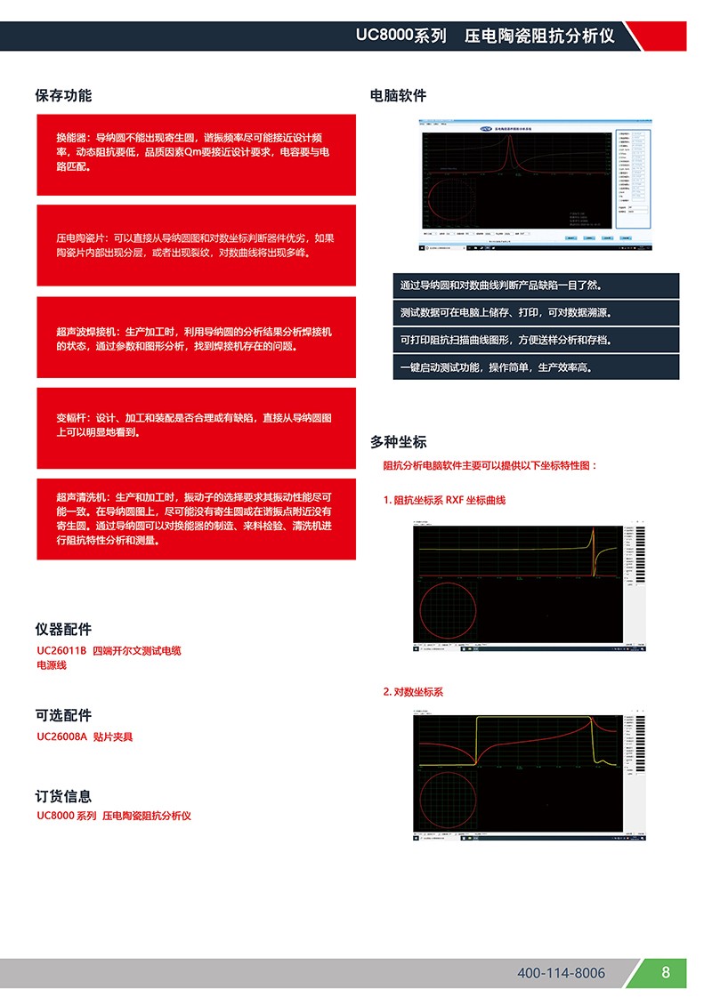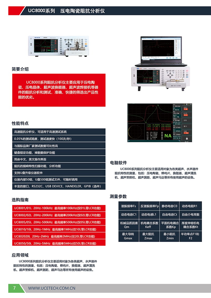 UC8000系列阻抗分析儀主要應(yīng)用于壓電陶瓷、壓電晶體、超聲波換能器、超聲波焊接機(jī)等器件的阻抗分析和測(cè)試,準(zhǔn)確、快捷的篩選出產(chǎn)品性能的優(yōu)劣。